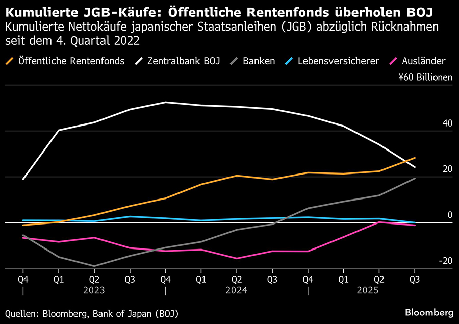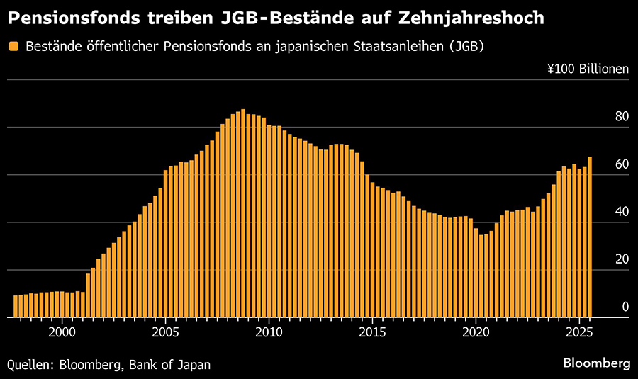 Die Staatsanleihenbestände öffentlicher Pensionsfonds beliefen sich im dritten Quartal 2025 auf 67,6 Billionen Yen und lagen damit deutlich unter den 522,2 Billionen Yen der BoJ. Strategen gehen jedoch davon aus, dass selbst eine moderate Umschichtung – oder ein klares Signal – helfen könnte, die Stimmung an einem Markt zu stabilisieren, an dem Anleger angesichts der hohen Volatilität am sehr langen Ende vorsichtig geblieben sind.