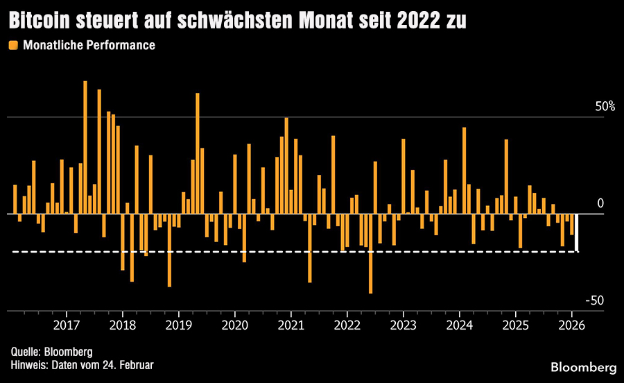 Bitcoin hat seine Talfahrt am Dienstagmorgen (24.2.) fortgesetzt und damit Kurs auf den stärksten monatlichen Rückgang seit den Unternehmenszusammenbrüchen in der Branche vor knapp vier Jahren genommen.