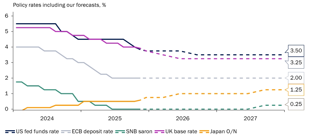 Vor dem Hintergrund der weltweit zahlreichen Zinssenkungen des vergangenen Jahres liegen die meisten Leitzinsen bereits nahe ihrer neutralen Niveaus. "Wir erwarten dieses Jahr nur bei der Fed und der Bank of England Zinssenkungen", prognostizierte Junius (siehe auch folgende Grafik), wobei der nächste Zinsschritt nach unten in den USA erst später im Jahr, nach der Ablösung von Fed-Chef Jerome Powell, erfolgen werde. Die EZB wird nach Einschätzung von Junius die Leitzinsen im Jahr 2026 unverändert lassen.