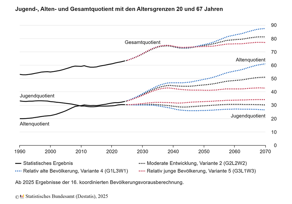 "Bereits jetzt kommen auf 100 Personen im Erwerbsalter 33 Personen im Rentenalter. Im Jahr 2070 werden es im günstigsten Fall 43 Personen im Rentenalter sein", sagte Karsten Lummer, Leiter der Abteilung "Bevölkerung" im Statistischen Bundesamt. "Im ungünstigsten Fall mit einer dauerhaft niedrigen Geburtenrate und niedriger Nettozuwanderung könnte der Altenquotient sogar auf 61 steigen. Damit würde sich der Wert im Vergleich zu heute fast verdoppeln", so Lummer. "Dann kämen auf eine Leistungsempfängerin oder einen Leistungsempfänger aus den Alterssicherungssystemen weniger als zwei Einzahlende."