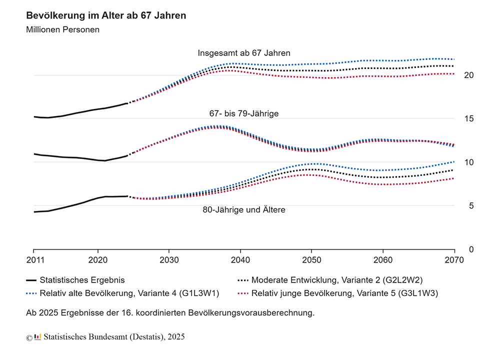 Im Jahr 2035 wird jeder vierte Mensch in Deutschland 67 Jahre oder älter sein. Das zeigen alle Varianten der neuen, 16. koordinierten Bevölkerungsvorausberechnung, die das Statistische Bundesamt (Destatis) vorgestellt hat. 2024 lag der Anteil der Menschen über 67 Jahren noch bei 20 Prozent. Die Alterung wird durch den Übergang der geburtenstarken Babyboomer in den Ruhestand getrieben – gefolgt von deutlich kleineren Jahrgängen.
