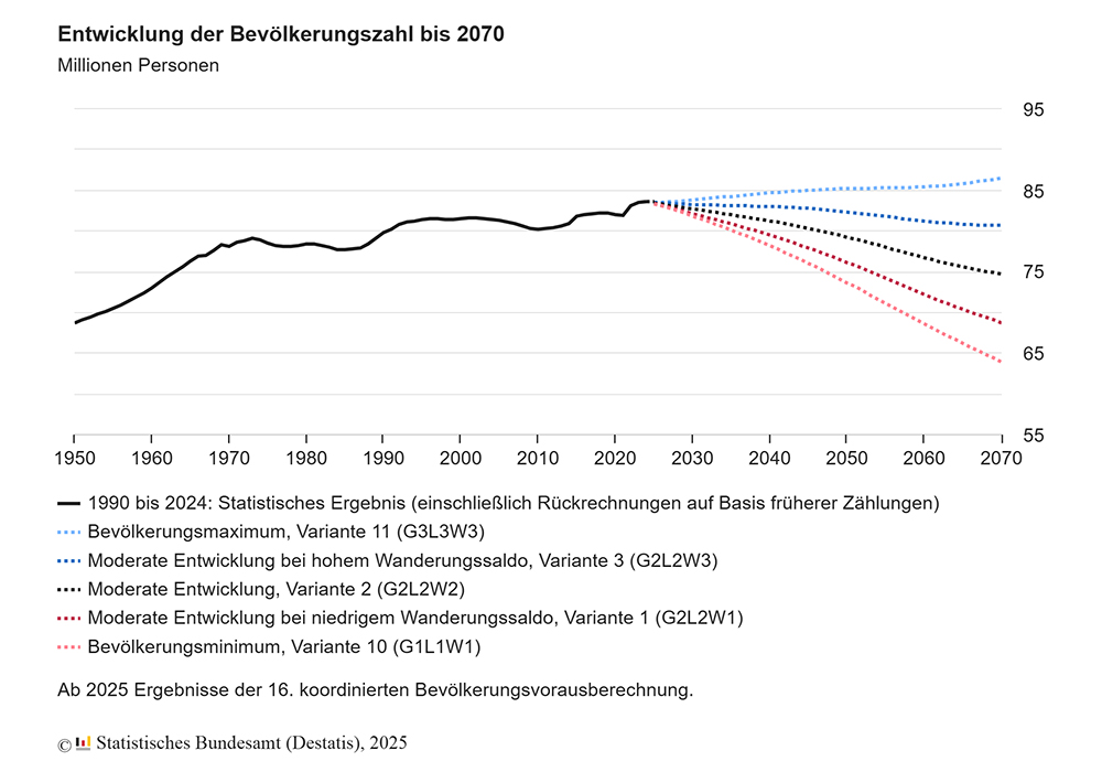 Nach den derzeitigen Annahmen wird Deutschland 2070 weniger Einwohner haben als heute. Bei moderaten Geburtenraten, Lebenserwartungs- und Wanderungsannahmen würde die Bevölkerung auf 74,7 Millionen zurückgehen. Nur zwei der 27 Varianten zeigen Wachstum – beide basieren auf hoher Nettozuwanderung plus deutlich steigender Geburtenrate. Insgesamt reicht die Spanne der Projektionen für 2070 von 63,9 bis 86,5 Millionen Menschen.