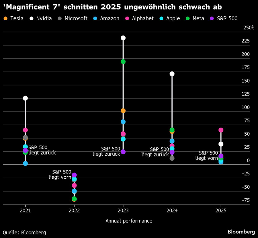 Erstmals seit 2022 entwickelten sich die meisten Unternehmen der sogenannten "Magnificent Seven" schwächer als der S&P 500. Zwar legte der "Bloomberg Magnificent Seven Index" 2025 um 25 Prozent zu, gegenüber 16 Prozent beim S&P 500. Der Großteil der Outperformance sei jedoch auf Alphabet und Nvidia zurückzuführen.