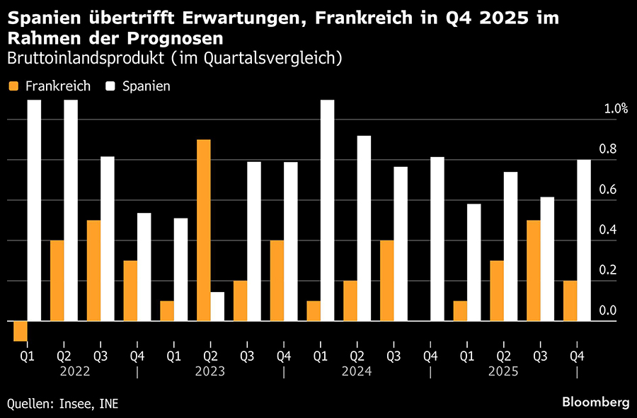 Das Bruttoinlandsprodukt Spaniens stieg im vierten Quartal um 0,8 Prozent – das stärkste Wachstum seit mehr als einem Jahr und deutlich über der mittleren Schätzung von 0,6 Prozent in einer Umfrage der Nachrichtenagentur "Bloomberg" unter Analysten. In Frankreich legte das BIP um 0,2 Prozent zu und entsprach damit den Erwartungen. Allerdings fiel das Wachstum geringer aus als in den vorangegangenen drei Monaten.