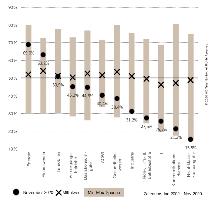 "Aktuell weichen die Zahlen allerdings erheblich vom langfristigen Schnitt ab: In der Energie- und Finanzbrache hätte der Affe eine gute Chance gehabt, den Markt zu schlagen: Die Daten liegen hier oberhalb von 60 Prozent", hält Lehmann fest. "Besonders schlecht wären des Affen Chancen bei den Kommunikationsdiensten (21,3 Prozent) und den Nicht-Basiskonsumgütern (15,5 Prozent) gewesen."