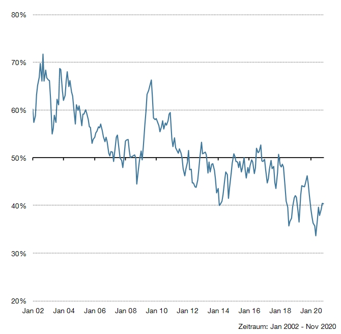 Anteil der Titel des MSCI ACWI, die den Index auf ein Jahr geschlagen haben