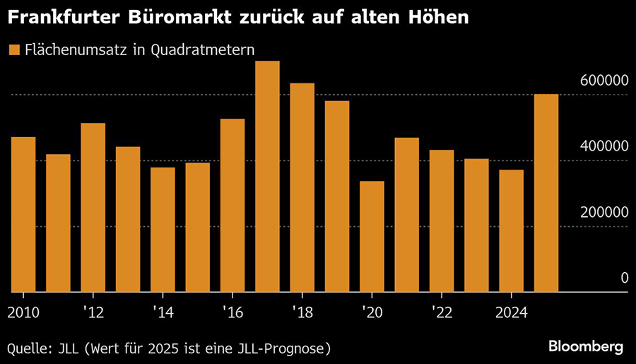 Für den Frankfurter Bürovermietungsmarkt wird 2025 wohl eines der besten Jahre seit Langem werden. Das hat Suat Kurt, Niederlassungsleiter des Immobiliendienstleisters JLL in Frankfurt, im Interview mit "Bloomberg News" erklärt. Die Befürchtungen mancher Beobachter, der Siegeszug des Homeoffice lasse den Markt dauerhaft einbrechen, bewahrheiten sich offenbar nicht.