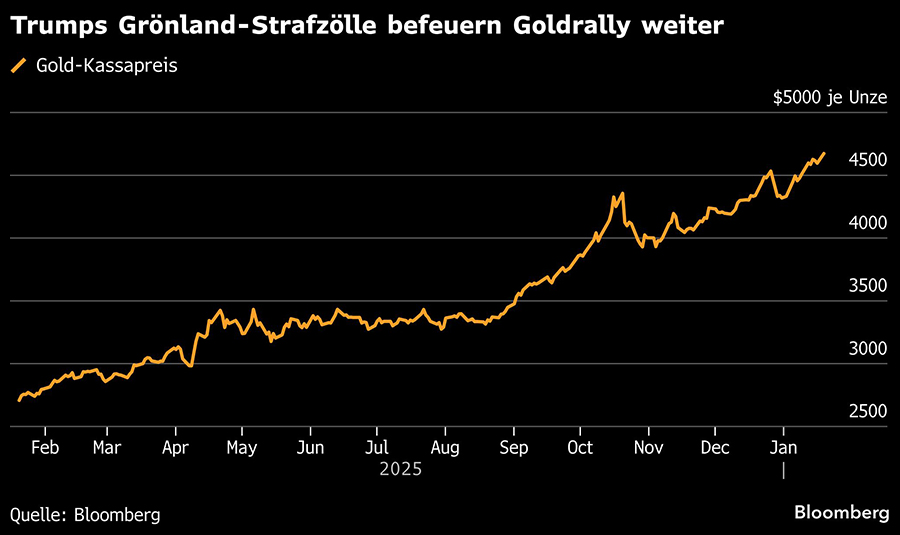 Die Preise von Gold und Silber haben neue Rekordhochs erreicht, nachdem US-Präsident Donald Trump wegen des Streits um Grönland angekündigt hat, Strafzölle gegen europäische Länder zu verhängen. Am Kassamarkt kostete die Unze Gold am Montagmorgen (19.1.) zeitweise 4.690,59 US-Dollar und damit 2,1 Prozent mehr als am Freitagabend (16.1.). Silber wurde temporär erstmals zu 94,12 Dollar je Unze gehandelt – 4,4 Prozent höher als am Freitag.