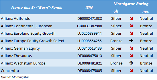 Das Morningstar-Team sieht die Auswirkungen bei den deutschen Fonds als besonders hoch an, da hier nach dem Abgang von Born ein neues Team am Werk sei, das sein Können – trotz unzweifelhafter Expertisen einzelner Handelnder – noch nicht in einem eigenen Publikumsfonds mit einer vergleichbaren Strategie unter Beweis gestellt habe (siehe Tabelle).