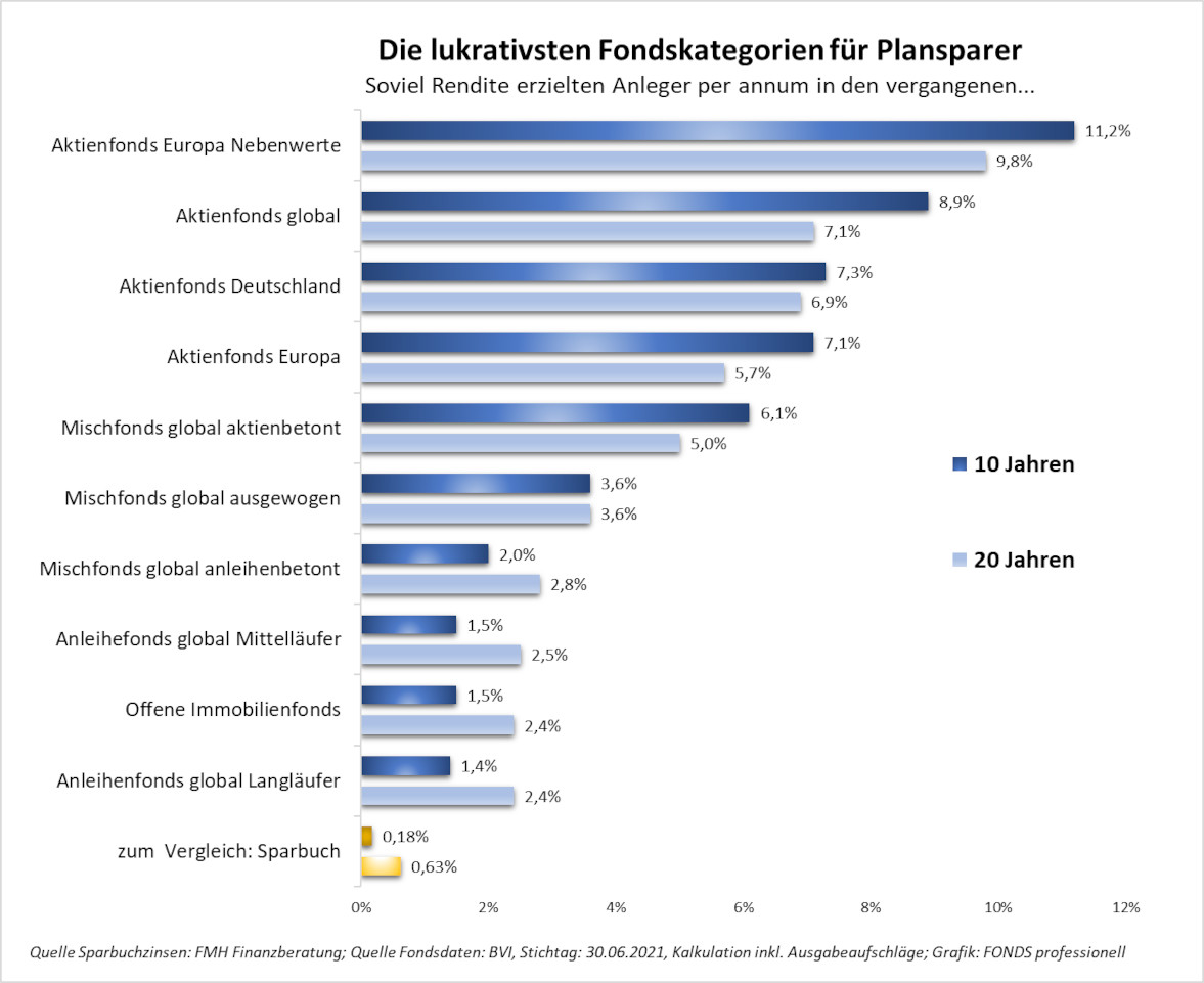 Die erzielbare Rendite jedenfalls gibt den Fondssparern recht: Wie lukrativ das ratierliche Investieren in Portfolios ist, zeigt zum wiederholten Mal die aktualisierte Wertentwicklungsstatistik des deutschen Fondsverbands BVI (Stand: Ende Juni 2021) auf eindrucksvolle Weise. Während Sparerlieblinge wie Fest- oder Tagesgeld mit Sicherheit nur eins bringen, nämlich Kapitalverzehr, winken bei Fondssparplänen mit ziemlicher Gewissheit Jahresrenditen von drei Prozent und mehr – ein wenig Geduld vorausgesetzt.