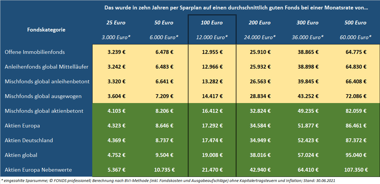 Wer sich für die in den letzten zehn Jahren lukrativste Gruppe "Aktienfonds Europa Nebenwerte" entschied, konnte – alle währenddessen aufgelaufenen Fondskosten und Ausgabeaufschläge eingerechnet – im Schnitt stolze 11,2 Prozent per annum dazu verdienen. In Euro ausgedrückt heißt das: Wer seit dem Sommer 2011 Monat für Monat mit je 100 Euro – also in Summe 12.000 Euro – einen durchschnittlich guten Aktienfonds besparte, der auf mittelständische und kleine Unternehmen aus Europa setzt, hätte Ende Juni 2021 auf seinem Depotauszug rund 21.470 Euro stehen, wie obige Tabelle zeigt.