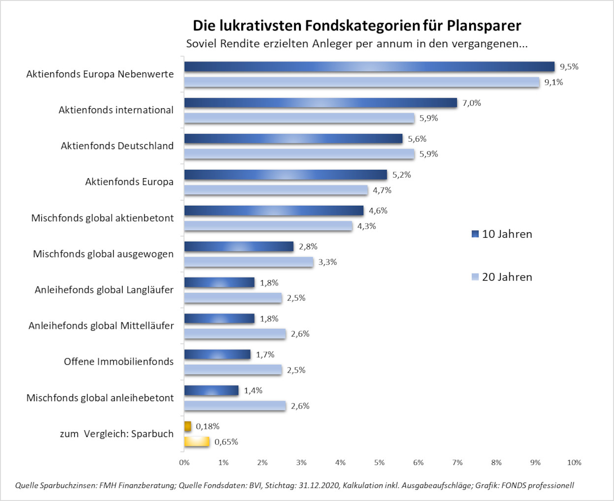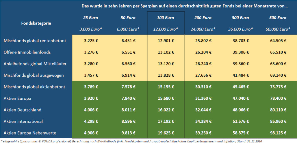 Wer sich für die in den vergangenen zehn Jahren lukrativste Portfoliogruppe "Aktienfonds Europa Nebenwerte" entschied, konnte – alle zwischenzeitlich anfallenden Fondskosten und Ausgabeaufschläge miteingerechnet – im Schnitt stolze 9,5 Prozent per annum dazu verdienen. In Euro ausgedrückt heißt das: Wer seit Januar 2011 Monat für Monat mit je 100 Euro – also in Summe 12.000 Euro – einen durchschnittlich guten Aktienfonds besparte, der auf mittelständische und kleine Unternehmen aus Europa setzt, hätte per Ultimo 2020 auf seinem Depotauszug rund 19.625 Euro stehen, wie obige Tabelle zeigt.