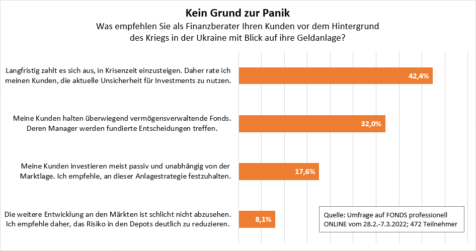 Mehr als zwei von fünf Teilnehmern raten ihren Kunden demnach, die jüngsten Kursverluste zum Einstieg zu nutzen. Jeder dritte gibt zu Protokoll, Asset-Allokations-Entscheidungen überwiegend an die Manager vermögensverwaltender Fonds delegiert zu haben – ihre Kunden selbst müssten daher nichts unternehmen. Knapp 18 Prozent meinen, ihre Mandanten investierten überwiegend passiv und unabhängig von der aktuellen Lage an den Finanzmärkten – diese Anlagestrategie gelte es nun durchzuhalten. Nur acht Prozent empfehlen, die Depots angesichts der unabsehbaren Entwicklung der Krise risikoärmer aufzustellen (siehe Grafik).
