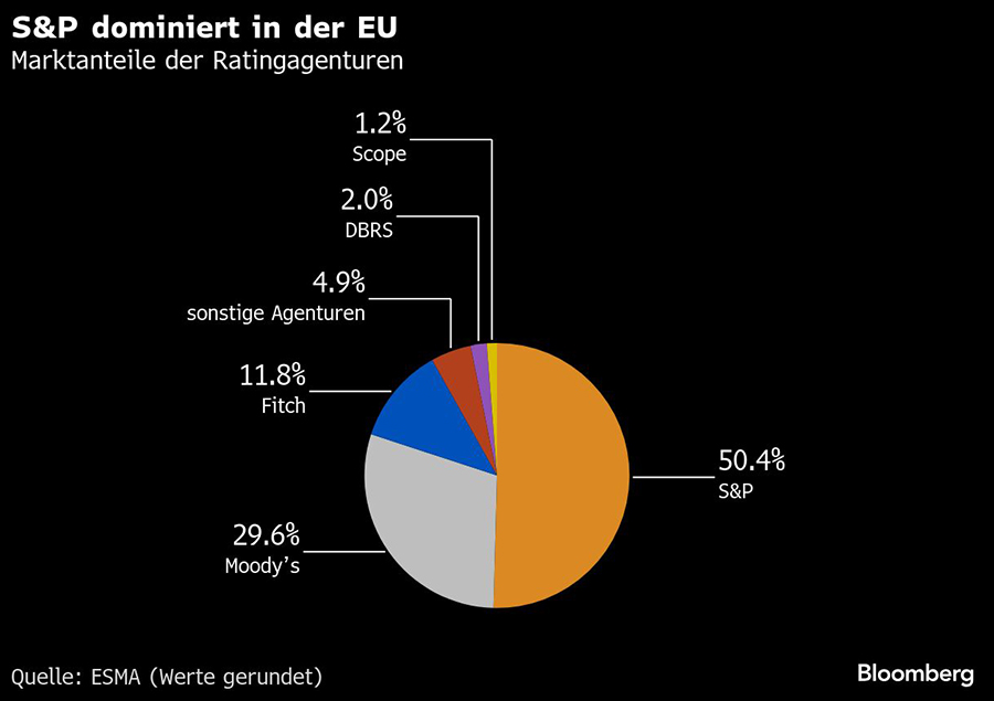 Beherrscht wird der Ratingmarkt in der EU laut der ESMA von den drei großen Branchenriesen S&P mit einem Marktanteil von 50,42 Prozent, Moody's mit 29,63 Prozent und Fitch mit 11,82 Prozent.