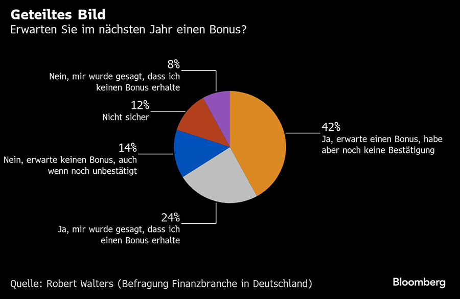 Rund zwei Drittel der Beschäftigten bei Banken und anderen Finanzdienstleistern in Deutschland gehen davon aus, dass sie einen Bonus im kommenden Jahr beziehungsweise bei der nächsten Bonus-Runde erhalten werden. Das geht aus der Gehaltsstudie 2026 des Personaldienstleisters Robert Walters hervor, die der Nachrichtenagentur "Bloomberg" vorab exklusiv vorliegt.