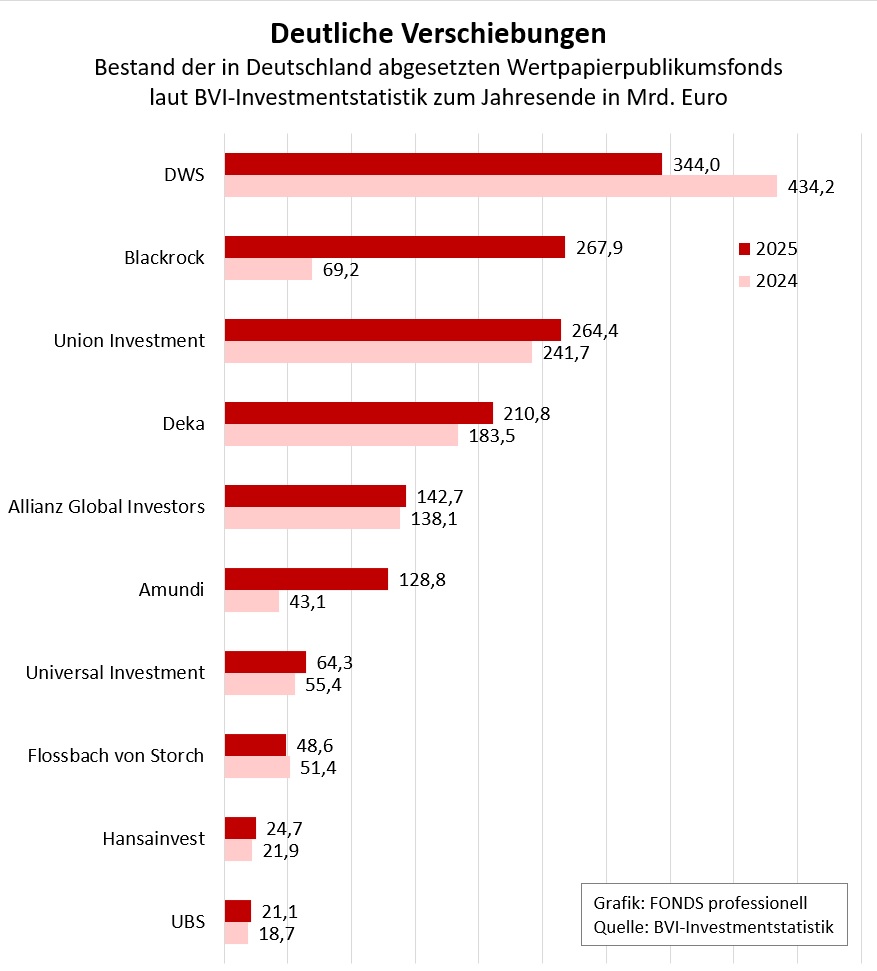 Großer Gewinner dieser Methodik-Änderung ist Blackrock. Früher hatte der US-Asset-Manager dem BVI nur die von seiner Münchner Kapitalverwaltungsgesellschaft aufgelegten iShares-ETFs gemeldet, die iShares-Produkte aus Irland und Luxemburg blieben außen vor. Das hat sich mit der Statistik-Umstellung geändert. Nun werden alle iShares-ETFs berücksichtigt, die in einem deutschen Bankdepot liegen – unabhängig vom Fondsdomizil. Das ist der wesentliche Grund dafür, warum der Bestand der in Deutschland abgesetzten Blackrock-Fonds von knapp 70 Milliarden Euro per Ende 2024 auf annähernd 270 Milliarden Euro per Ende 2025 nach oben schnellte.