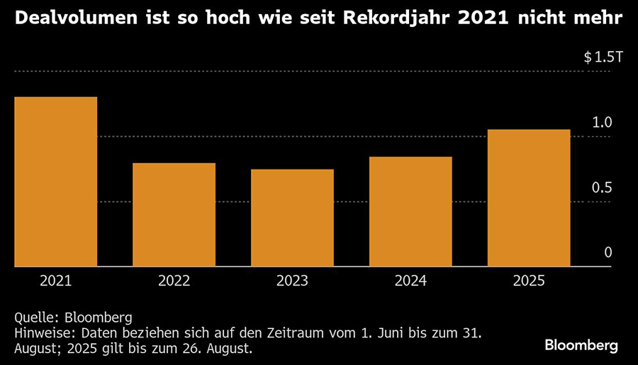 Das Geschäft mit Fusionen und Übernahmen hat im traditionell ruhigen Sommer weltweit die Marke von einer Billion US-Dollar überschritten – getrieben von einem Schub an Transaktionen im August. Seit Anfang Juni wurden laut "Bloomberg"-Daten Deals im Wert von 1,05 Billionen Dollar verkündet. Das entspricht einem Plus von 30 Prozent gegenüber dem Vorjahr und ist der höchste Wert für diesen Zeitraum seit dem Rekordsommer 2021, als die Pandemie einen Boom an Übernahmen auslöste.