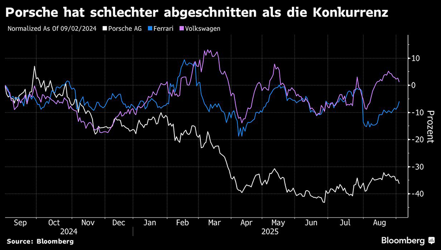 Die Porsche AG verlässt nach weniger als drei Jahren den Dax. Wie der Indexanbieter Stoxx am Mittwoch (3.9.) mitteilte, wird der vom Volkswagen-Konzern ausgegliederte Luxusautohersteller am 22. September aus dem deutschen Leitindex genommen. Porsche hat seinen Ausblick in diesem Jahr bereits drei Mal nach unten korrigiert. Belastet wird der Produzent von Sportwagen und High-End-SUVs von den von US-Präsident Donald Trump verhängten Zöllen auf europäische Fahrzeuge, schwacher Nachfrage nach Elektroautos sowie rückläufigen Verkaufszahlen in China. Die Aktie verlor in den vergangenen zwölf Monaten rund 33 Prozent.