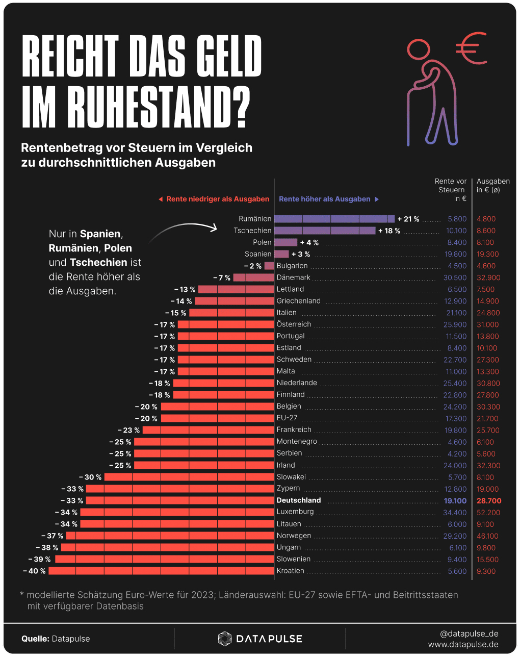 Deutschland zählt einer aktuellen Analyse von Datapulse zufolge zu den europäischen Ländern mit der größten Rentenlücke. Die durchschnittliche gesetzliche Altersrente von 19.138 Euro pro Jahr reicht bei Weitem nicht aus, um die geschätzten jährlichen Lebenshaltungskosten der über 60-Jährigen in Höhe von 28.663 Euro zu decken. Daraus ergibt sich ein Defizit von 33 Prozent – einer der höchsten Werte in Europa. Nur in sechs Ländern fällt die Rentenlücke noch größer aus. In Österreich ist die Differenz deutlich geringer: Bei einer durchschnittlichen gesetzlichen Rente von 25.900 Euro und jährlichen Lebenshaltungskosten von 31.000 Euro ergibt sich eine Lücke von 17 Prozent.