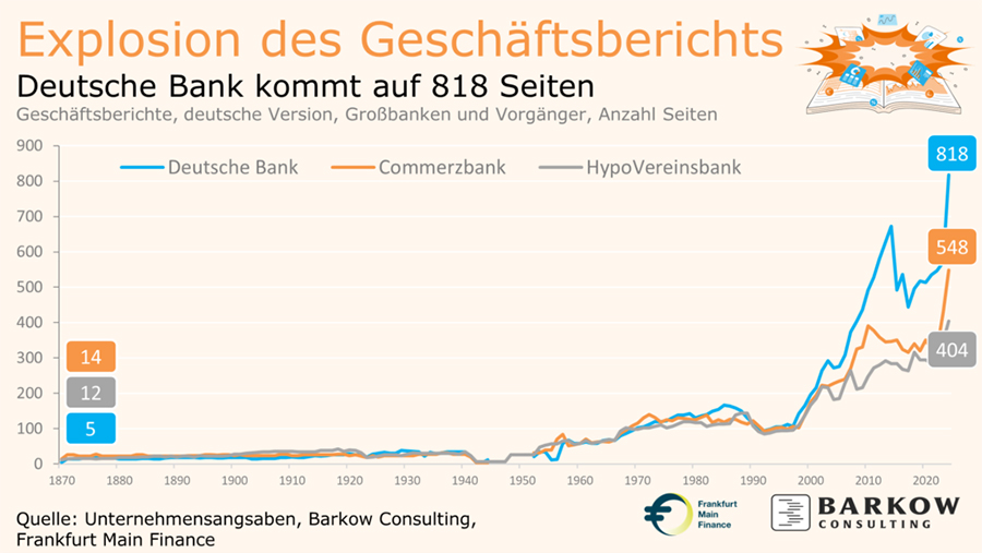 Der Geschäftsbericht der Deutschen Bank hat eine neue Größenordnung erreicht. Wie das Research-Haus Barkow Consulting mitteilt, umfasst der Bericht für 2024 insgesamt 818 Seiten. Gegenüber dem Vorjahr bedeutet das ein Plus von 247 Seiten beziehungsweise 43 Prozent. Damit liegt das Dokument erstmals auch über dem US-Formular 20-F, das 2025 auf 706 Seiten kommt. Der umfangreiche Bericht gilt unter Analysten seit Jahren als fordernde Lektüre.