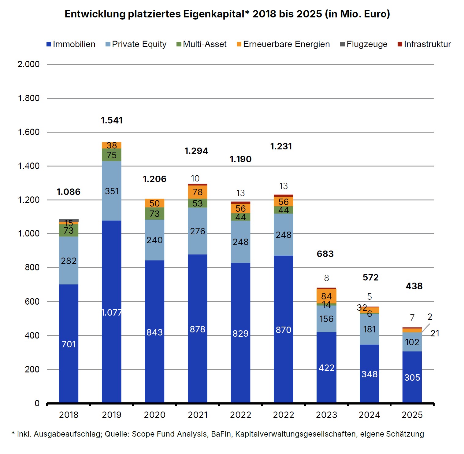 Scope erklärt den starken Rückgang des Angebotsvolumens mit einem hohen Überhang aus dem Vorjahr. Ende 2024 hatten 778 Millionen Euro des bis dahin prospektierten Volumens noch keine Anleger gefunden. Hinzu kommt, dass nur noch sehr wenige großvolumige Fonds mit einem Volumen oberhalb 50 Millionen Euro emittiert werden, die Verunsicherung des Markts durch die schwächelnden Immobilienmärkte tat ihr Übriges. Die Anzahl neu zugelassener geschlossener Fonds hat sich von 20 auf nurmehr zehn halbiert. "Insbesondere außerhalb der Assetklasse Immobilien legen Anbieter ELTIFs anstatt oder zusätzlich zu Publikums-AIF auf", begründet Scope.