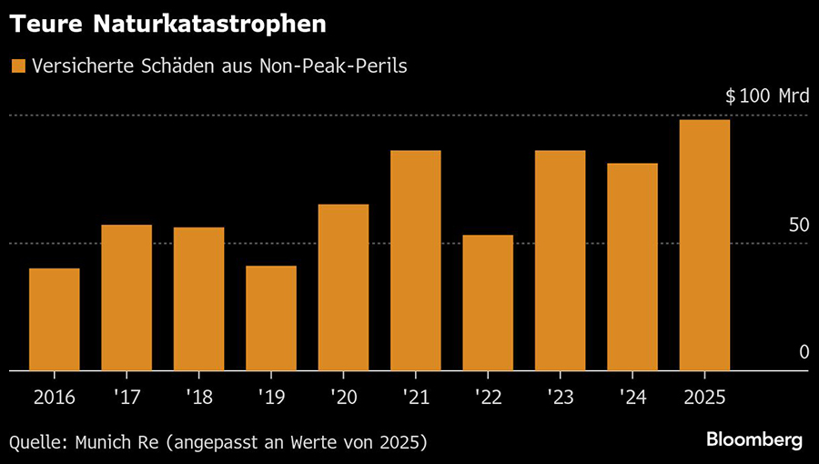 "Non-Peak-Perils werden in vielen Teilen der Welt immer heftiger und häufiger", sagte Tobias Grimm, Chefklimatologe von Munich Re, im Interview mit "Bloomberg News". "Studien zeigen, dass der Klimawandel bei dieser Entwicklung eine zunehmende Rolle spielt."