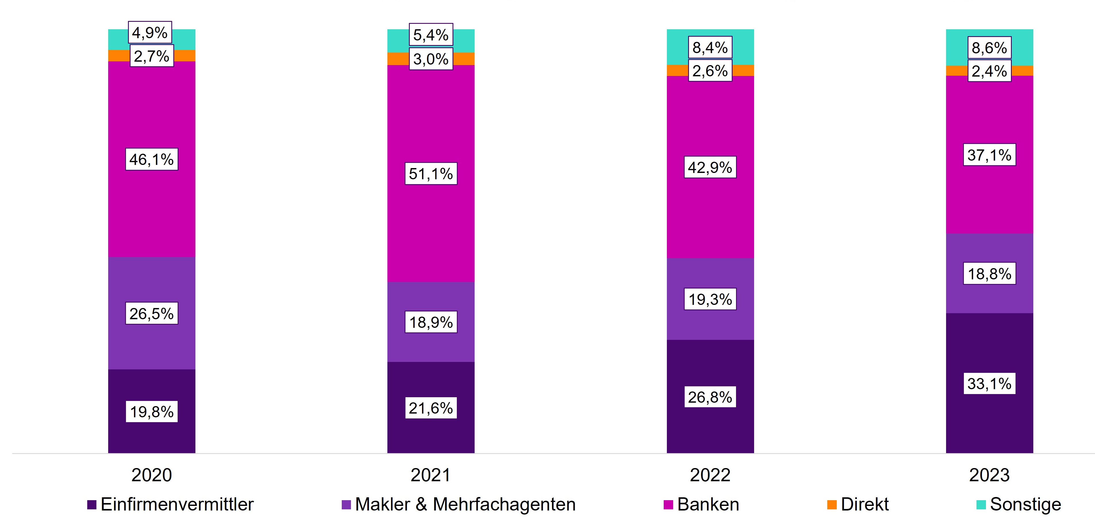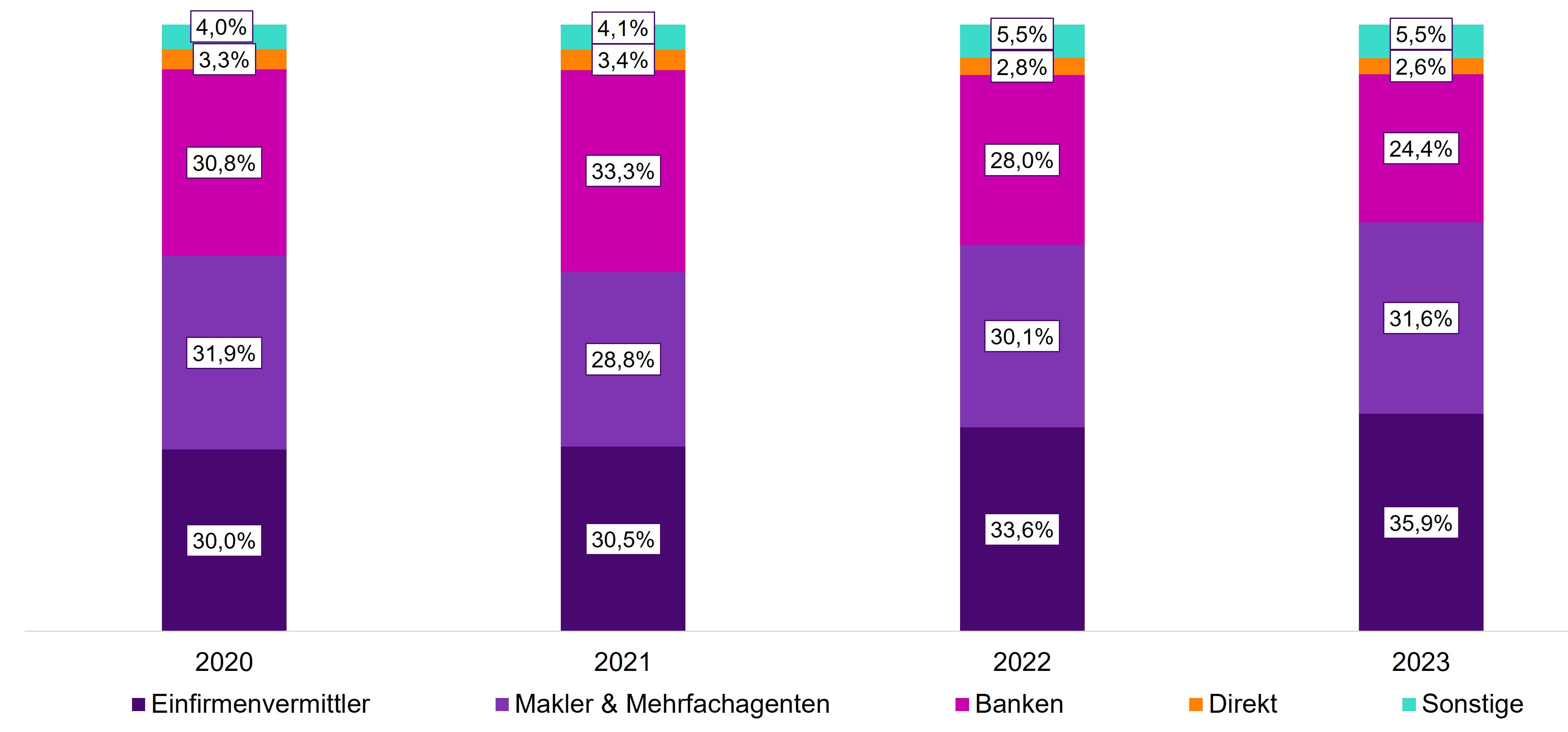 Anteile der Vertriebswege am eingelösten Neugeschäft (APE) 2020 bis 2023